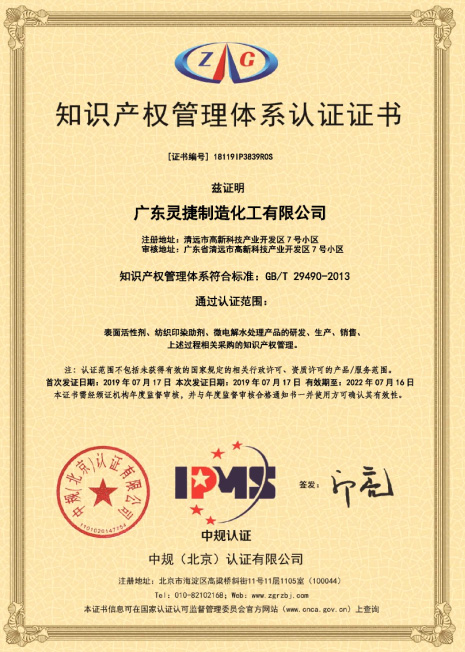 靈捷制造化工于2019年7月17日正式獲得由中規(guī)(北京)認(rèn)證公司頒發(fā)的《知識(shí)產(chǎn)權(quán)管理體系認(rèn)證證書(shū)》(證書(shū)編號(hào):18119IP3839R0S),這標(biāo)志著我公司在知識(shí)產(chǎn)權(quán)創(chuàng)造、運(yùn)用、管理和保護(hù)方面邁入國(guó)內(nèi)領(lǐng)先水平。